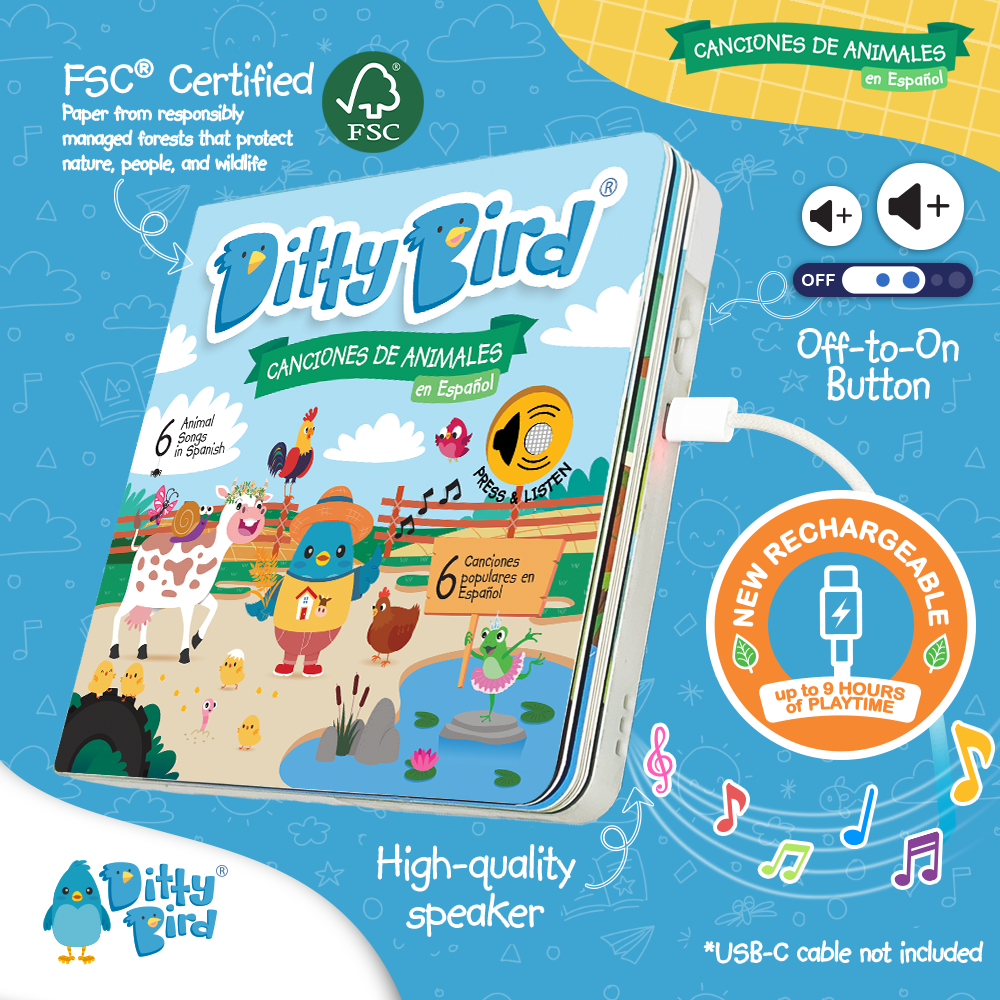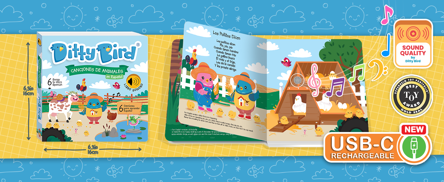 Bring the zoo to your home with Ditty Bird's Canciones de Animales en Español Sound Book! With its lively songs like "Los Pollitos dicen" and "Un Elefante se balanceaba," this book provides a fun and educational opportunity for children to learn about animals and Spanish language through music and interactive play.