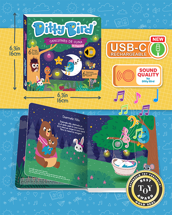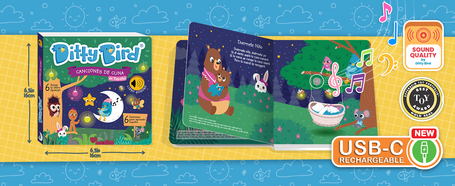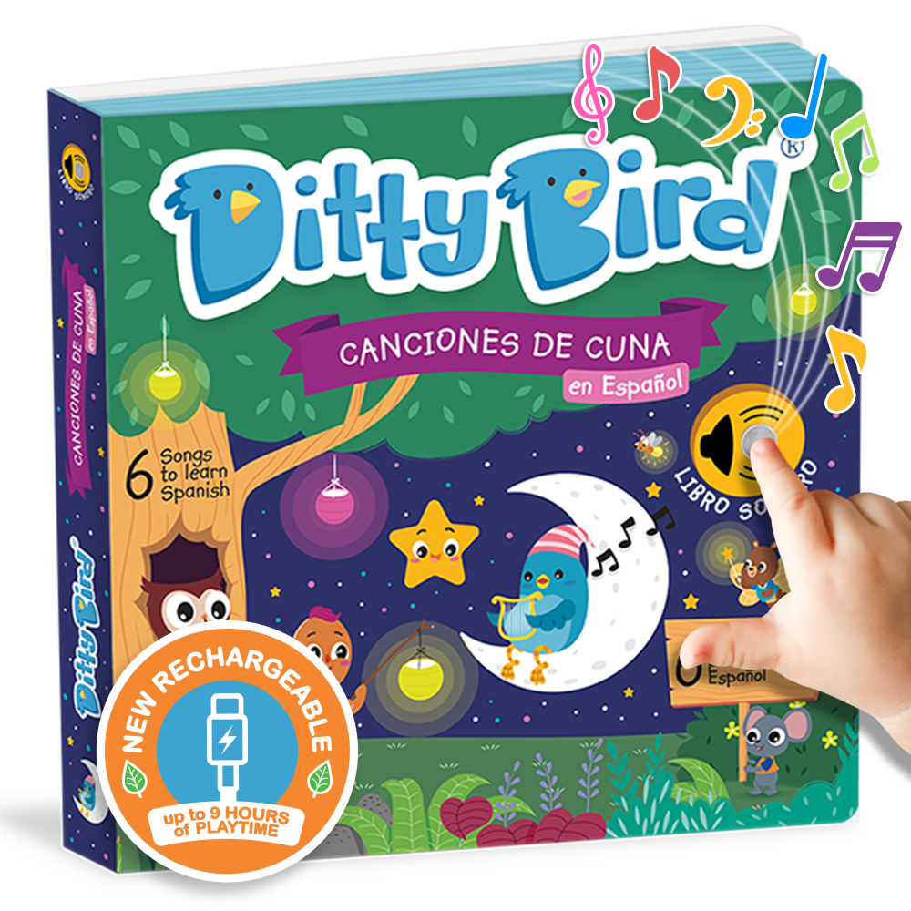 Say buenos noches with Ditty Bird's Canciones de Cuna en Español Sound Book! Featuring 6 classic lullabies such as "Estrellita, ¿dónde estás?" and "Arrorró mi Niño," this book offers a gentle and melodic way to soothe your little ones to sleep while introducing them to the beauty of the Spanish language.