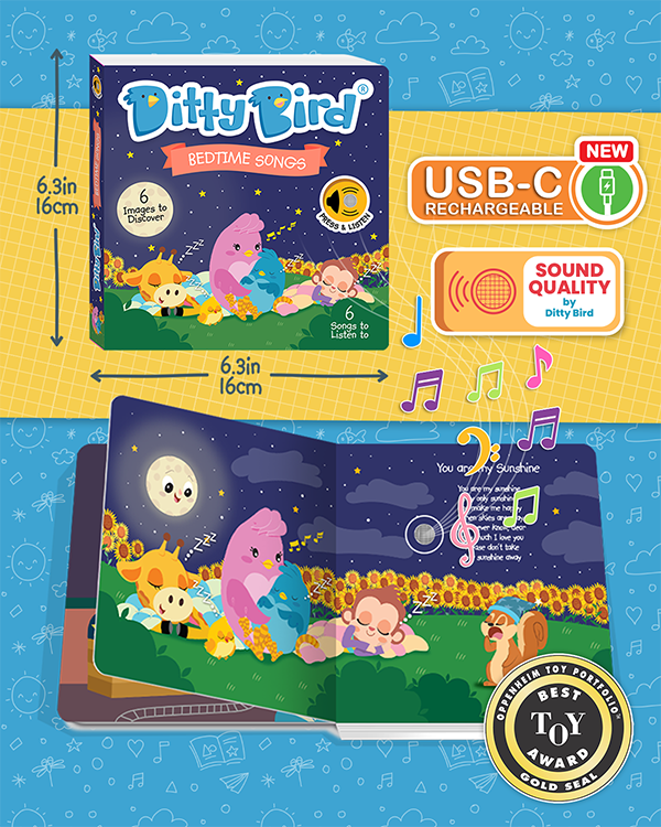 “We love Ditty Bird Books. My son - 1.5 knows how to turn them on and off on his own. He can get an hour (if not more) of entertainment out of these books. Great for when mom or dad need a second. Cute pictures, and great songs. Lyrics included on each page.” - April Smith