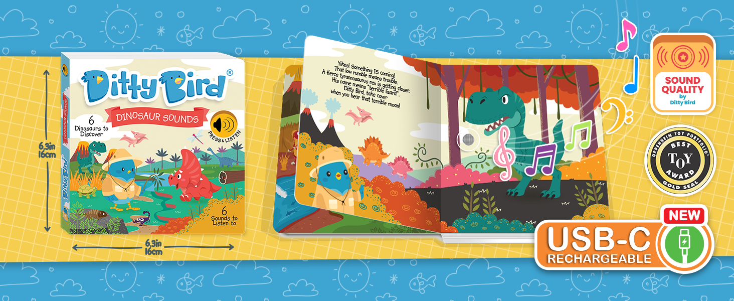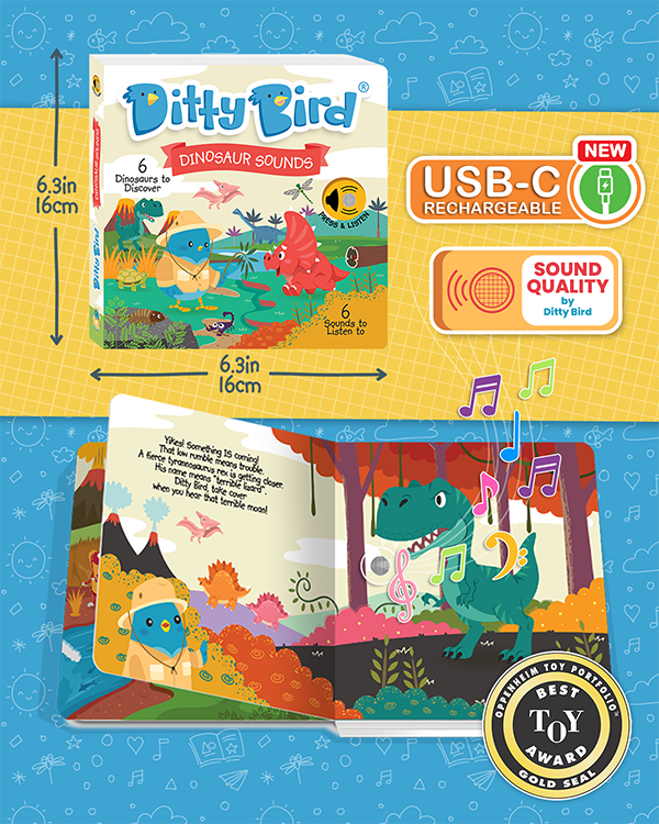 Roar into learning fun with Ditty Bird's Dinosaur Sounds book! Spark your little explorer's curiosity as they discover fascinating facts about dinosaurs while immersing themselves in lifelike prehistoric sounds—all at the touch of a finger!