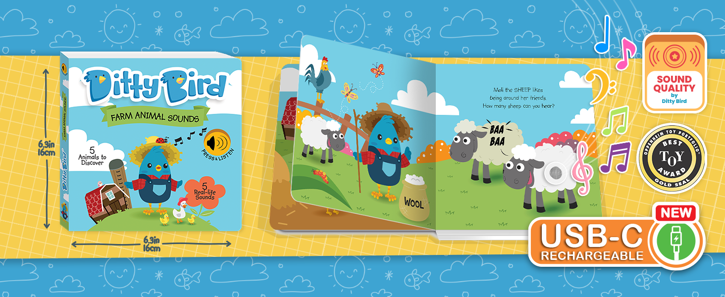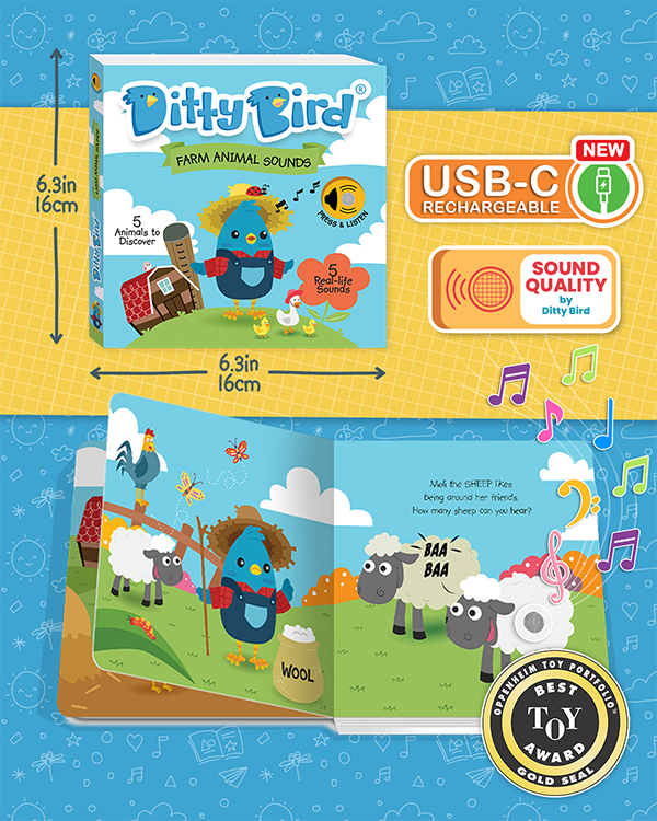 Take a delightful stroll through the farmyard with Ditty Bird's Farm Animal Sounds book! Press the sound button to hear real-life animal sounds like "Moo" and "Quack," while learning fun facts about beloved farm friends like Bella the Cow and Gavin the Horse.