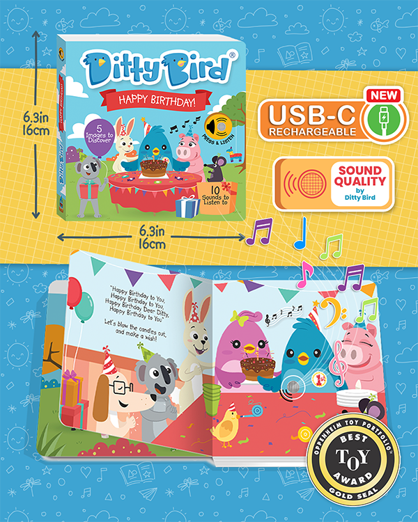 Make your child's birthday extra special with Ditty Bird's Happy Birthday musical book! From the cheerful "Happy Birthday to You" song to the sound of blowing candles, this interactive book brings the excitement of a birthday celebration to life with 10 'sound dots' to explore.