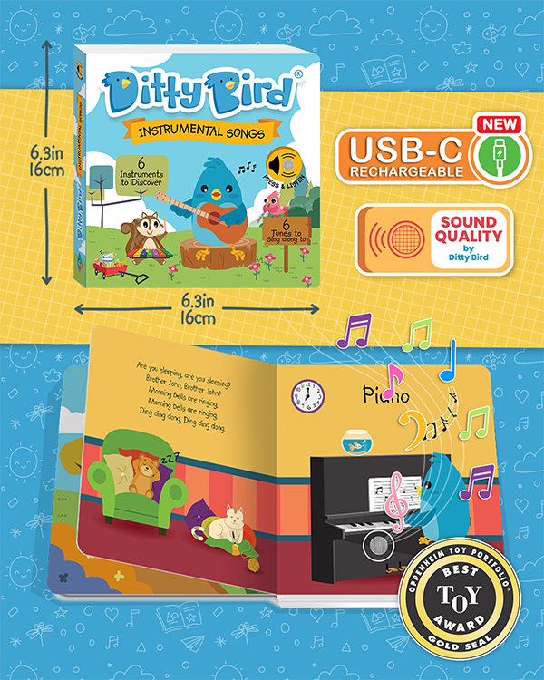 “We love Ditty Bird Books. My son - 1.5 knows how to turn them on and off on his own. He can get an hour (if not more) of entertainment out of these books. Great for when mom or dad need a second. Cute pictures, and great songs. Lyrics included on each page.” - April Smith