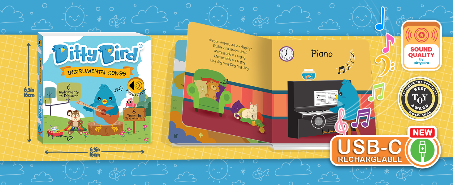 Turn storytime into a musical concert with Ditty Bird's Instrumental Songs sound book! Featuring six beloved children's songs played on various musical instruments, this book encourages active participation and auditory learning, making it an ideal choice for interactive play and musical exploration.
