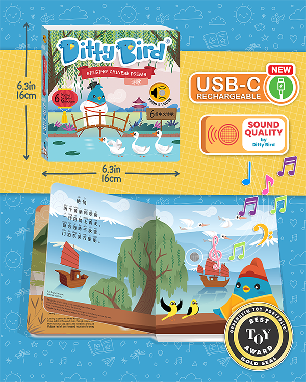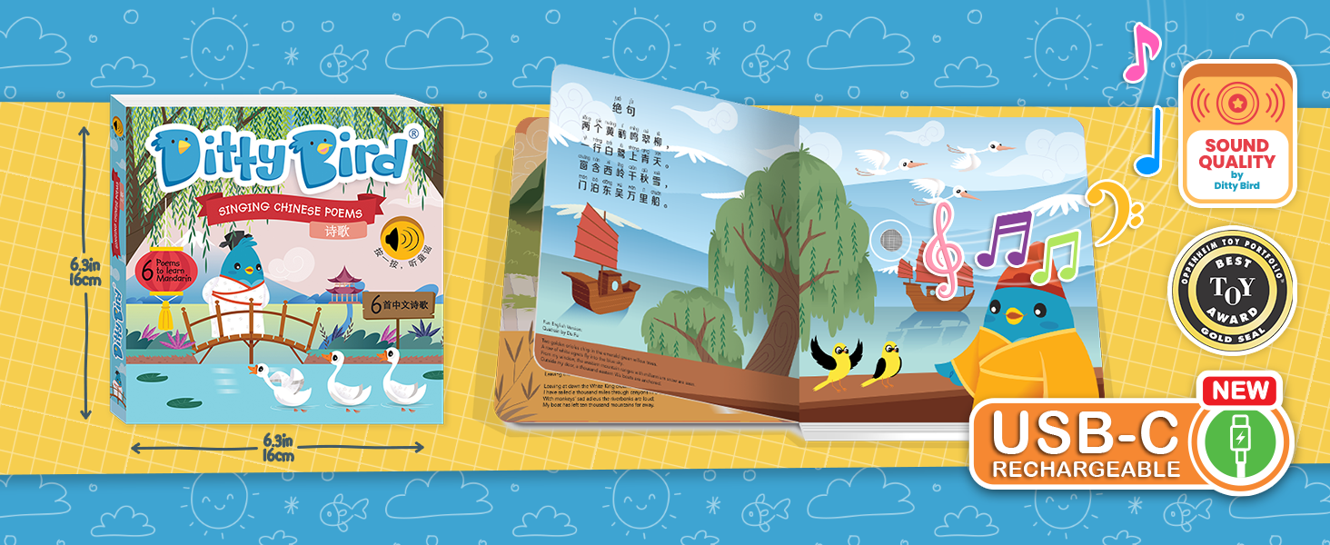 Make learning Chinese a delightful experience with Ditty Bird's Singing Chinese Poems Sound Book! By introducing children to iconic poems sung in Mandarin and English, this interactive book provides a fun and engaging way for young learners to develop language skills and cultural awareness.