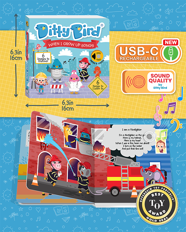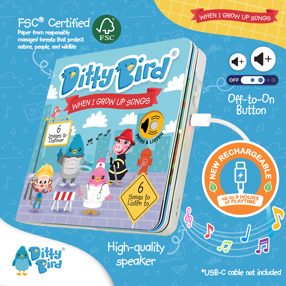 “We love Ditty Bird Books. My son - 1.5 knows how to turn them on and off on his own. He can get an hour (if not more) of entertainment out of these books. Great for when mom or dad need a second. Cute pictures, and great songs. Lyrics included on each page.” - April Smith